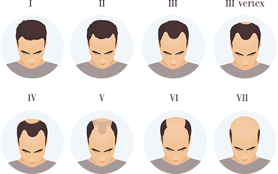 Dr. O’tar Norwood published a classification for male baldness in 1975. This classification entails two major patterns and also several less common ones. There are two main areas of hair loss: bitemporal recession and thinning over the crown. Hair loss in these two areas increase as baldness progresses leading to coalescence until front, top and crown are entirely bald. On careful evaluation by an expert, you may be categorized under one of the grades and appropriate treatment may be prescribed.